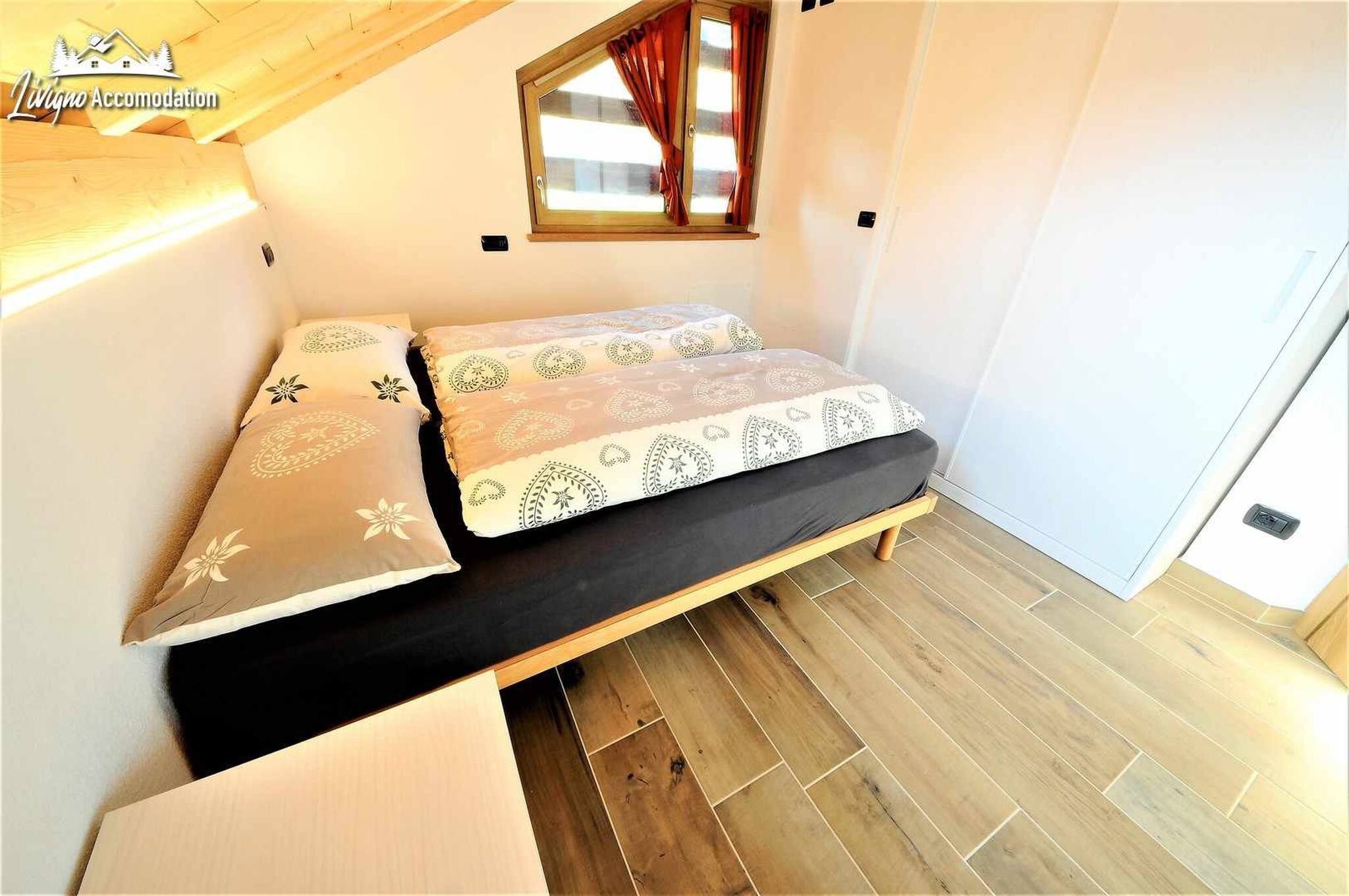 Die Innenräume bestehen aus einem Stockwerk mit einem geräumigen und hellen Wohnzimmer mit einem Doppelbettsofa, einer vollständigen Küche und einem Badezimmer mit Dusche, Toilette und Waschmaschine. Im zweiten Stock befindet sich ein Doppelzimmer, ein Zimmer mit Einzelbetten (oder Doppelbett) mit Matratzen von höchster Qualität sowie ein Badezimmer mit Toilette und Dusche. In der Wohnung finden Sie eine praktische und schnelle Induktionskochplatte, einen Backofen, eine Mikrowelle, eine Spülmaschine und viele Küchenutensilien.