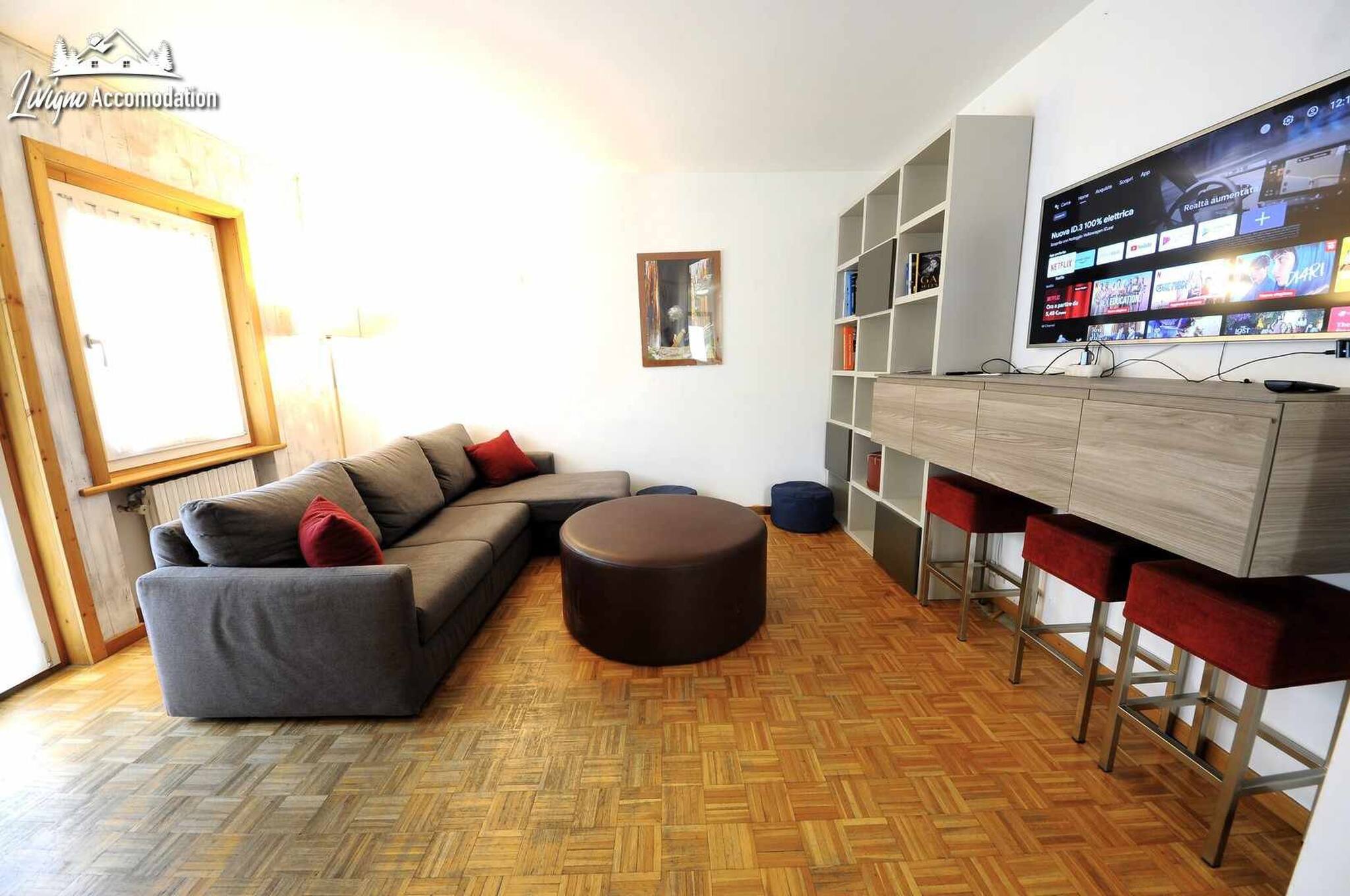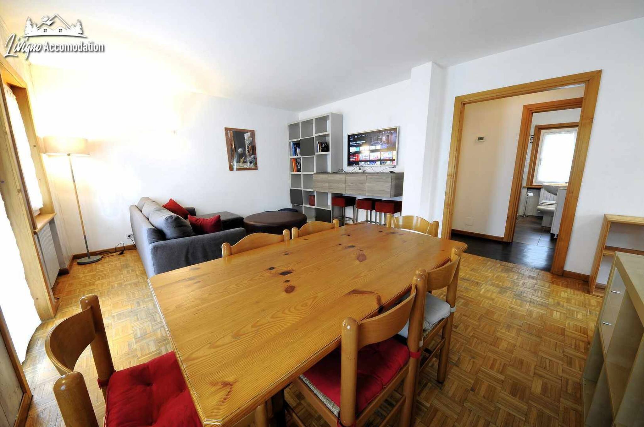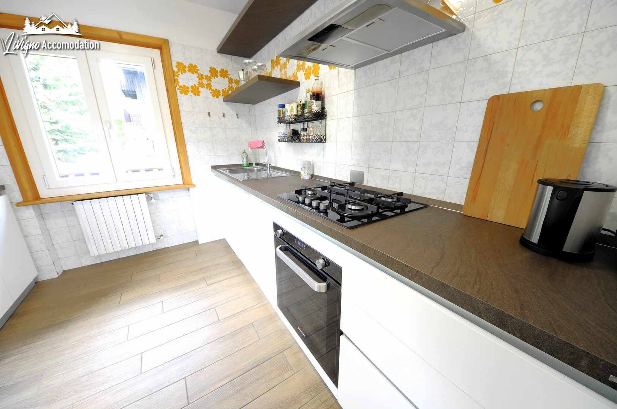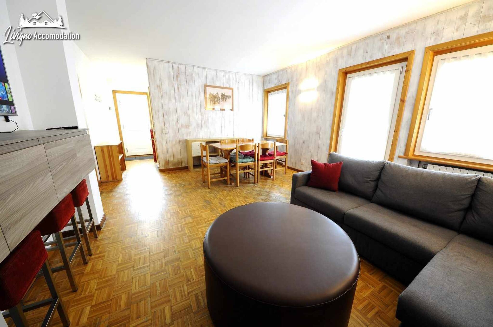 Chalet Riccio, a new construction that respects the Livigno tradition, welcomes you in a strategic location, a few steps from the Dairy, Aquagranda and the pedestrian area. The Aaron apartment, on the ground floor, offers spacious and bright spaces, thanks to the large windows overlooking the mountains. Furnished with a modern style, it is the ideal place for those seeking comfort and relaxation.